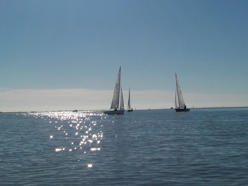 Fi and her crew had decide to give up too when suddenly the sea breeze put in an appearance and they were once again underway and closing the finish and the other two boats. The breeze held just long enough to bring them right up to about 50 yards off the line and directly abreast of Wind Sprite and Sarah Louise, before shutting down once again leaving all three boats stemming the tide just before the line. Eventually the northerly filled back in a tiny bit to allow Sarah Louise to finish fourth with Grethe fifth and Wind Sprite sixth.